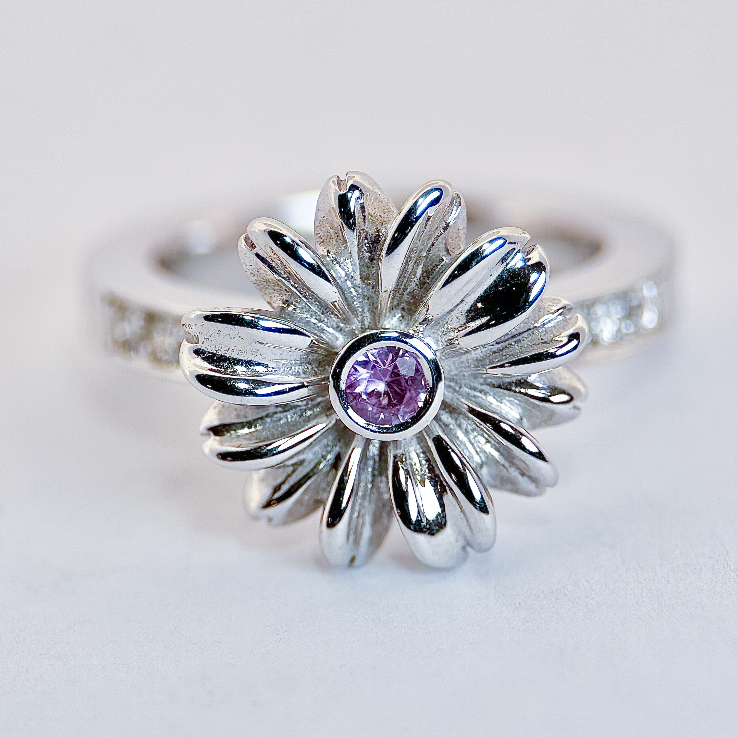 Den som är helt i vitguld 13gr 18K har en rosa safir i mitten 0,10ct och 6st briljanter 0,03ct/st tw-vs i ringskenan i strl 56/17 3/4