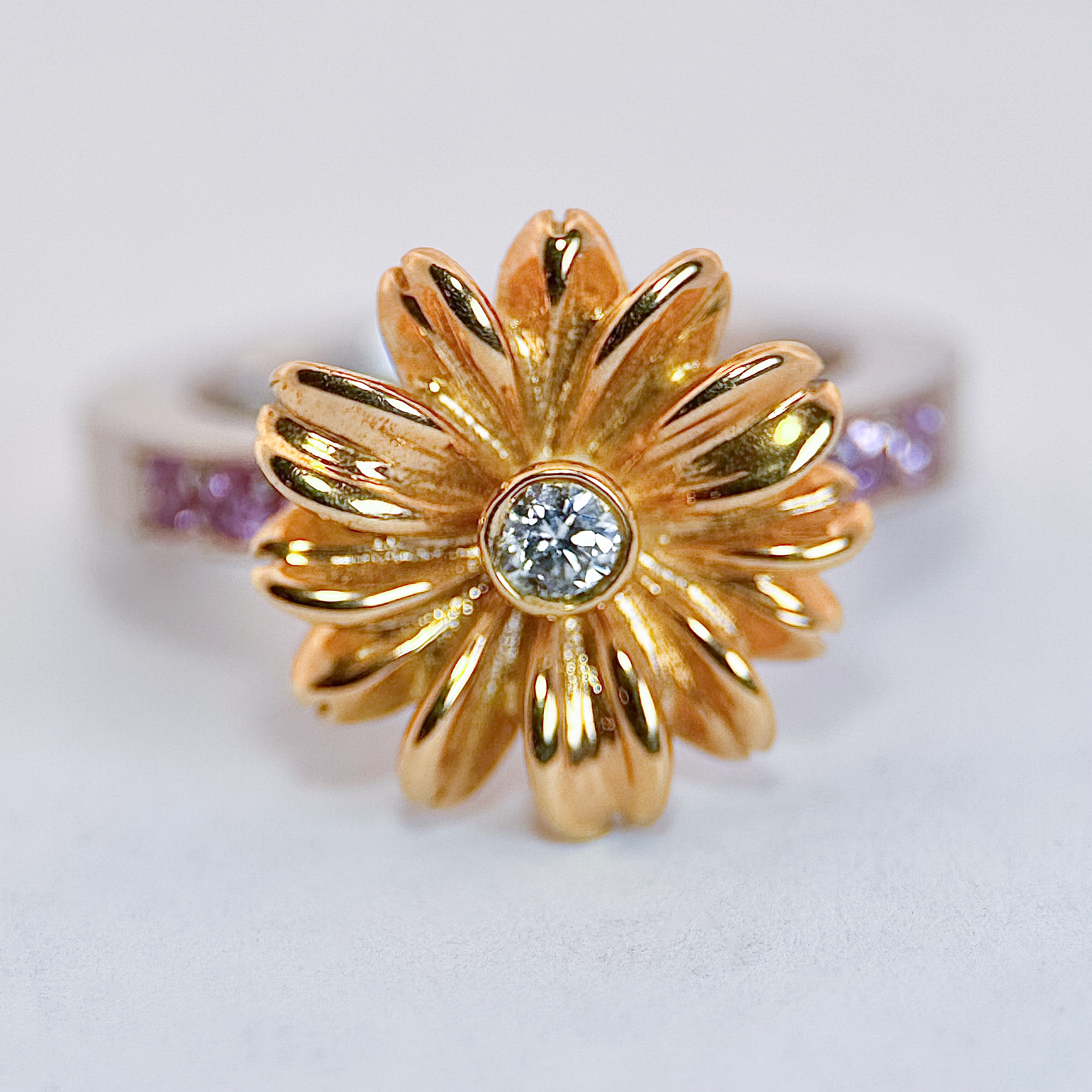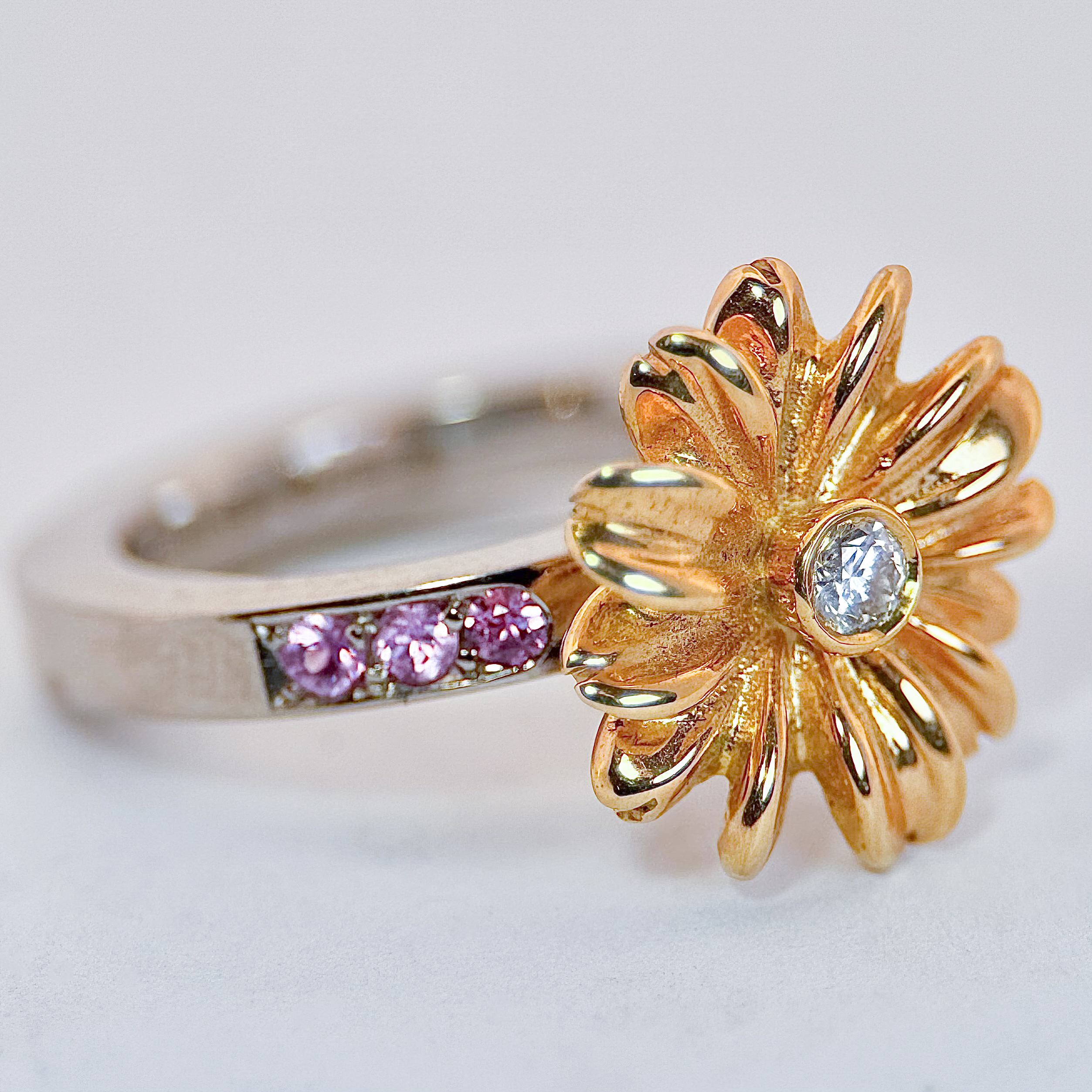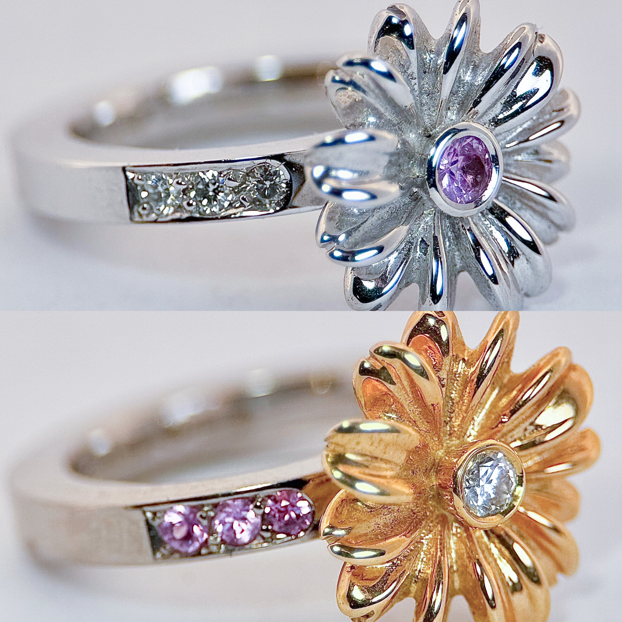 Dom här två ringarna finns klara, den som har en blomma i rödguld 12,4gr 18K är i strl 53/17 ringskenan i vitguld, briljant 0,10ct och 6st rosa safirer 0,03ct/st i ringskenan.
